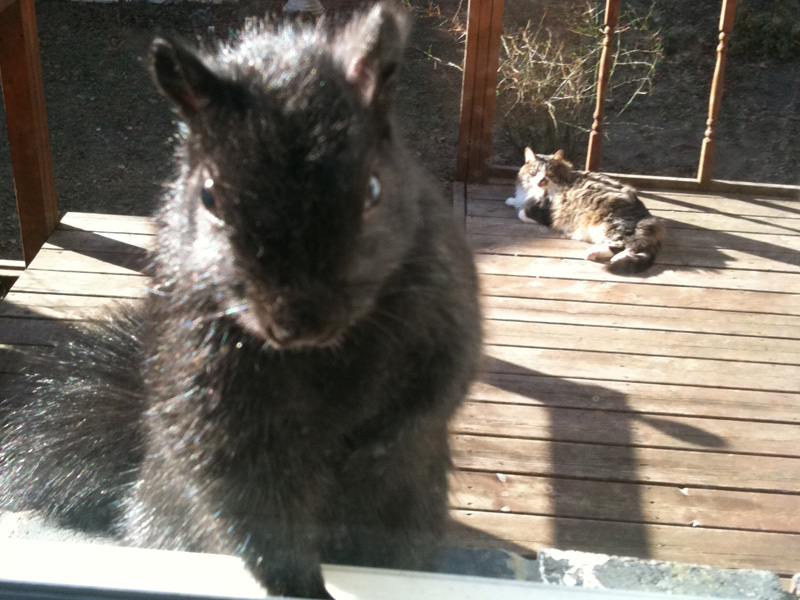 The cat doesn’t care and goes on lying there, and eventually the squirrels go back to what they were doing.